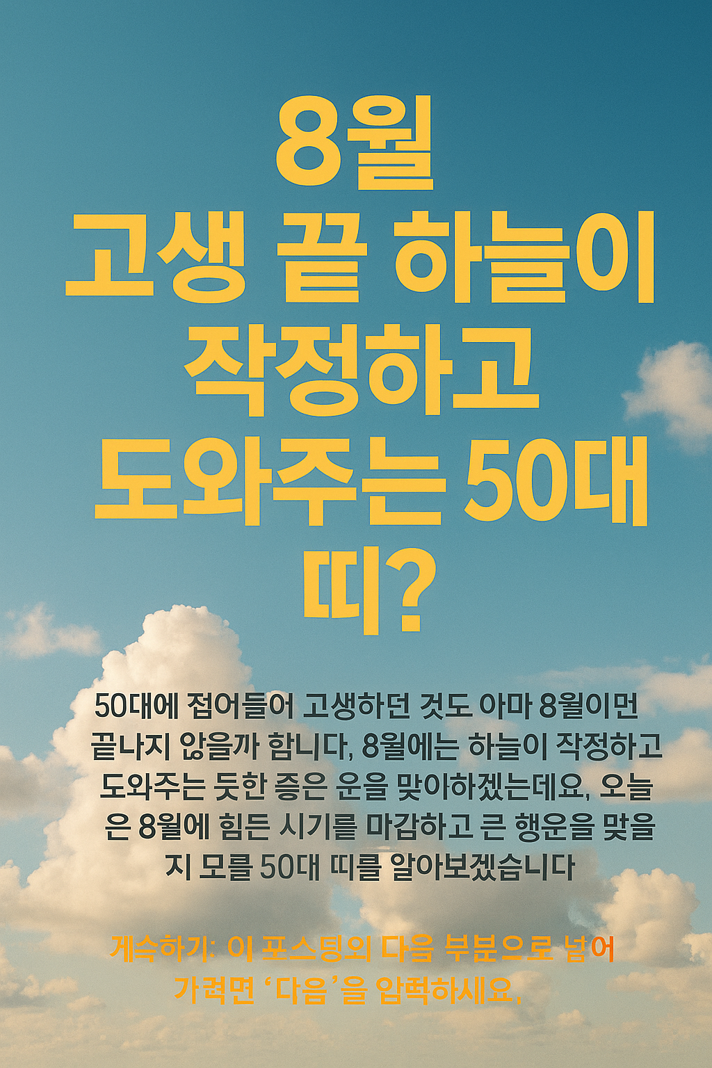 긴 시간 동안 유난히 고생 많았던 50대 분들, 올해도 반 이상이 지나가며 “과연 나에게도 좋은 날이 올까?”라는 의문이 드셨죠? 그런데 말입니다. 8월은 그중에서도 ‘특정 띠’를 가진 분들에게는 하늘이 작정하고 운을 밀어주는 시기입니다.