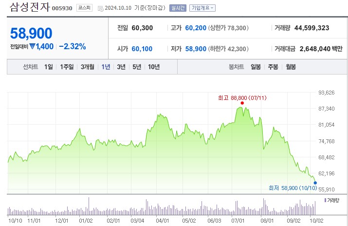 삼성전자는 현재 외국인 투자자들의 지속적인 매도세로 인해 주가가 큰 압박을 받고 있으며, 이는 한국 주식시장의