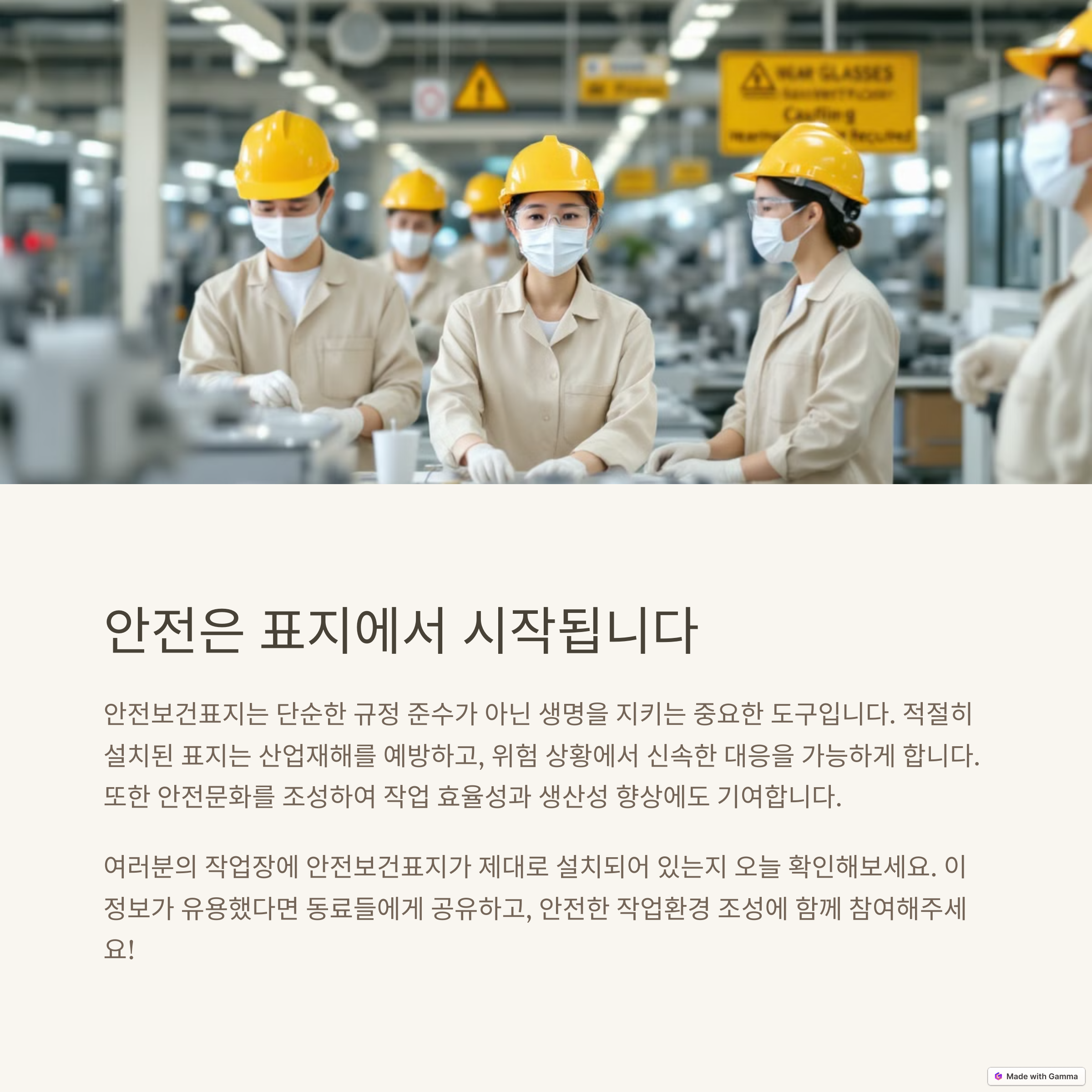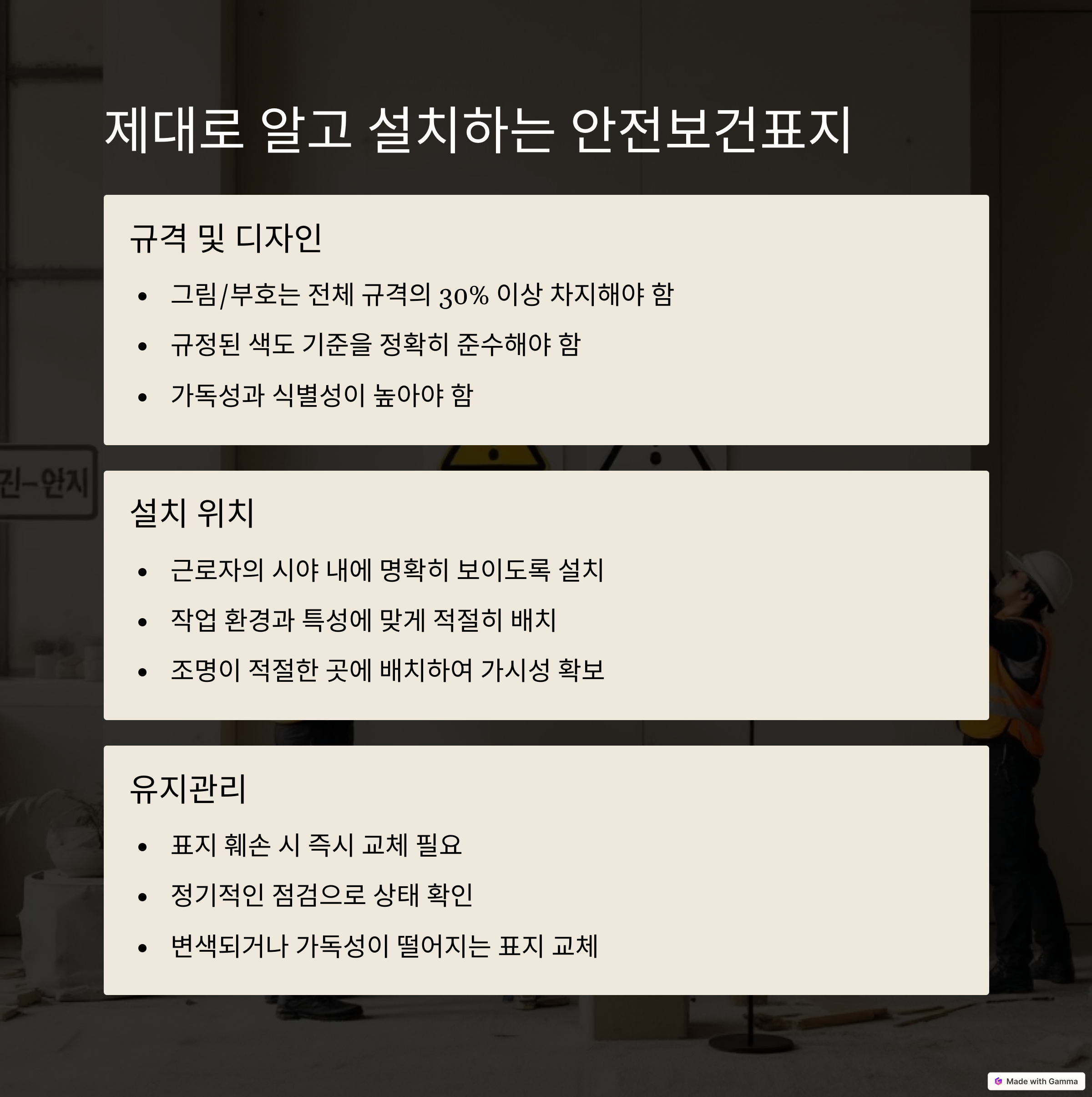 - 실제 작업현장 사진, 안전보건표지 디자인 예시 등을 함께 제시하면 이해도와 신뢰도가 높아집니다.