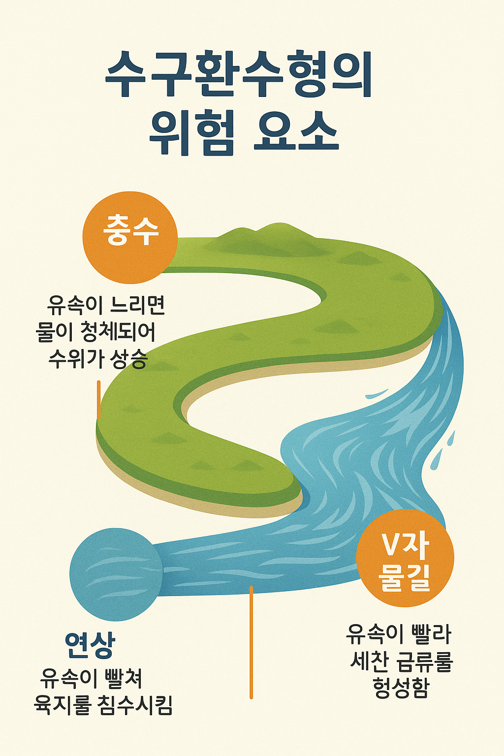 | 충수(沖水) | 곡률 내측 범람 | 제방·옹벽 완충 | 중류 배수펌프장 |