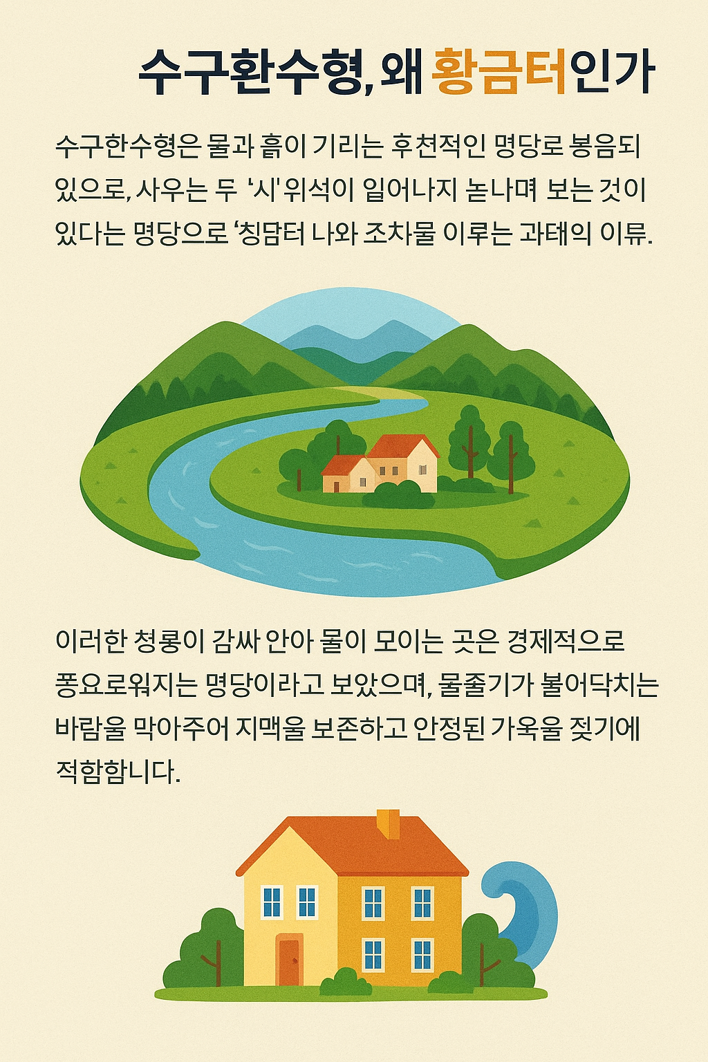 ▸ A. 곡률·유속·배후 산 높이 3 요소가 충족돼야 진정한 형국입니다. - Q. 위험 요소는 꼭 전문가만 해결?