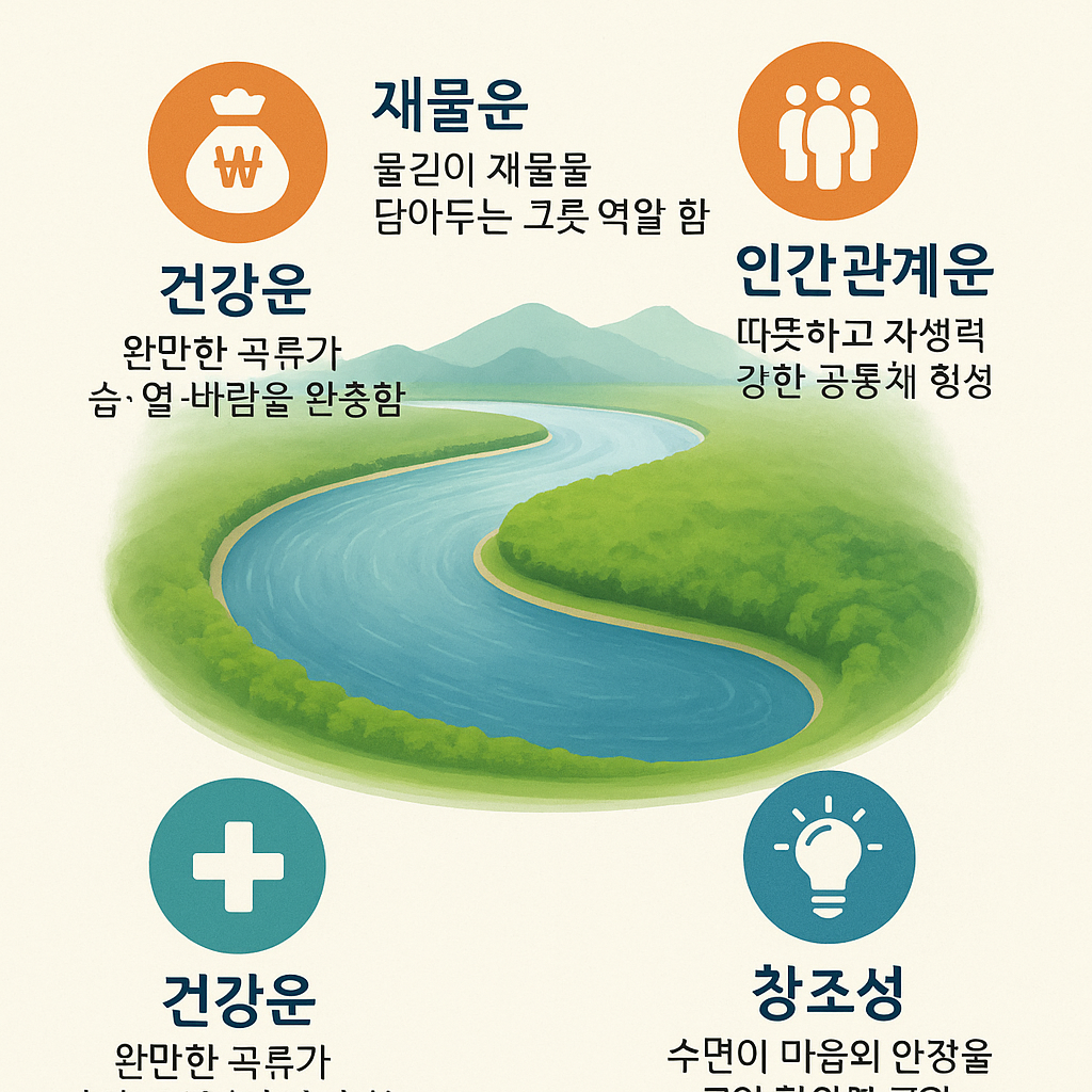 | 건강운 | 완만 곡류가 습·열·바람 완충 | 열섬현상 ↓, 미세먼지 농도 ↓ |