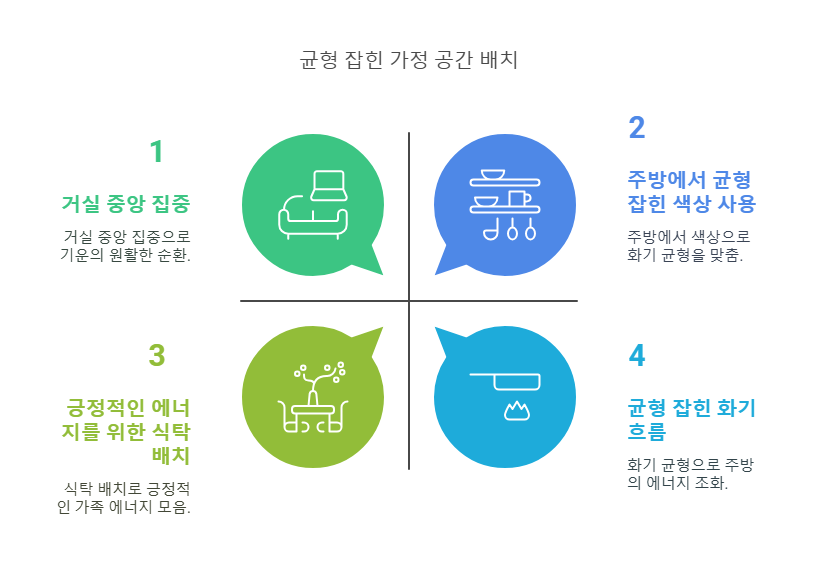 - 식탁의 위치: 식탁은 가족이 함께 모여 식사할 때 긍정적인 에너지가 모일 수 있도록 배치합니다.