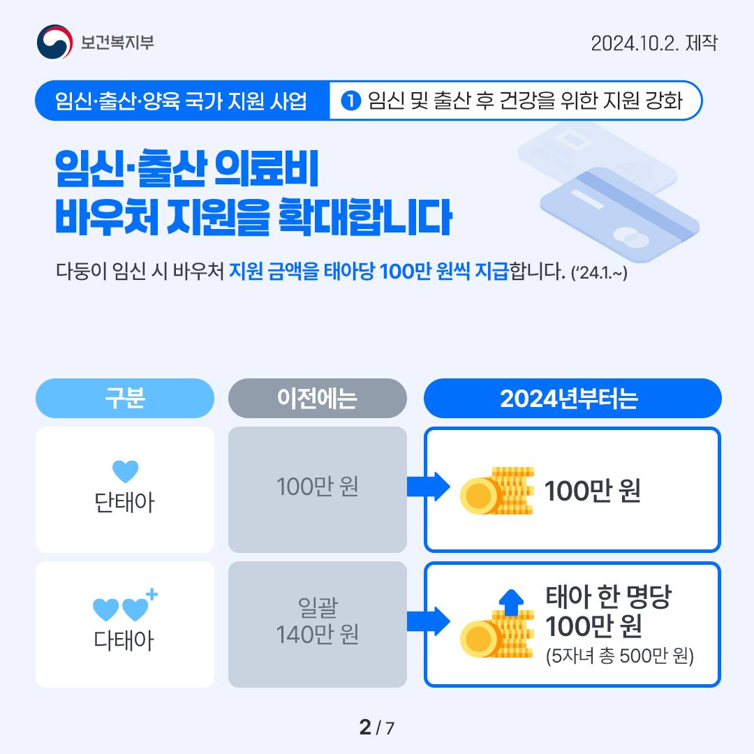 다둥이 임신 시 바우처 지원 금액을 태아당 100만 원씩 지급합니다. (’ 24.1.~)