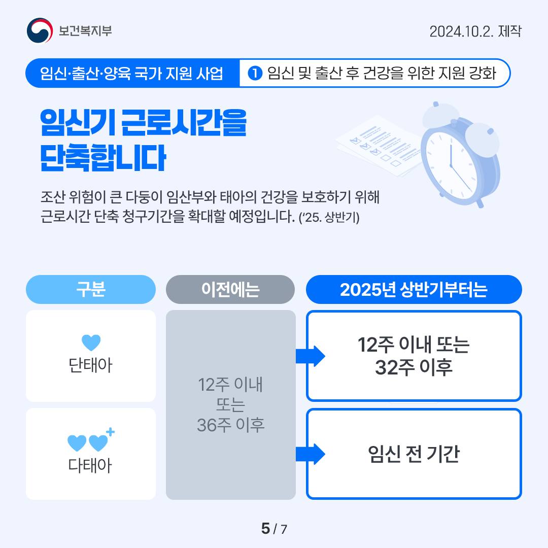 조산 위험이 큰 다둥이 임산부와 태아의 건강을 보호하기 위해 근로시간 단축 청구기간을 확대할 얘정입니다.