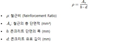 - 기둥이나 슬래브 등 다른 부재에서는 부재 형상에 맞춰 ρ=AsAc\rho = \frac{A_s}{A_c} (기둥) 또는 단위폭(슬래브) × 유효깊이를 적용.