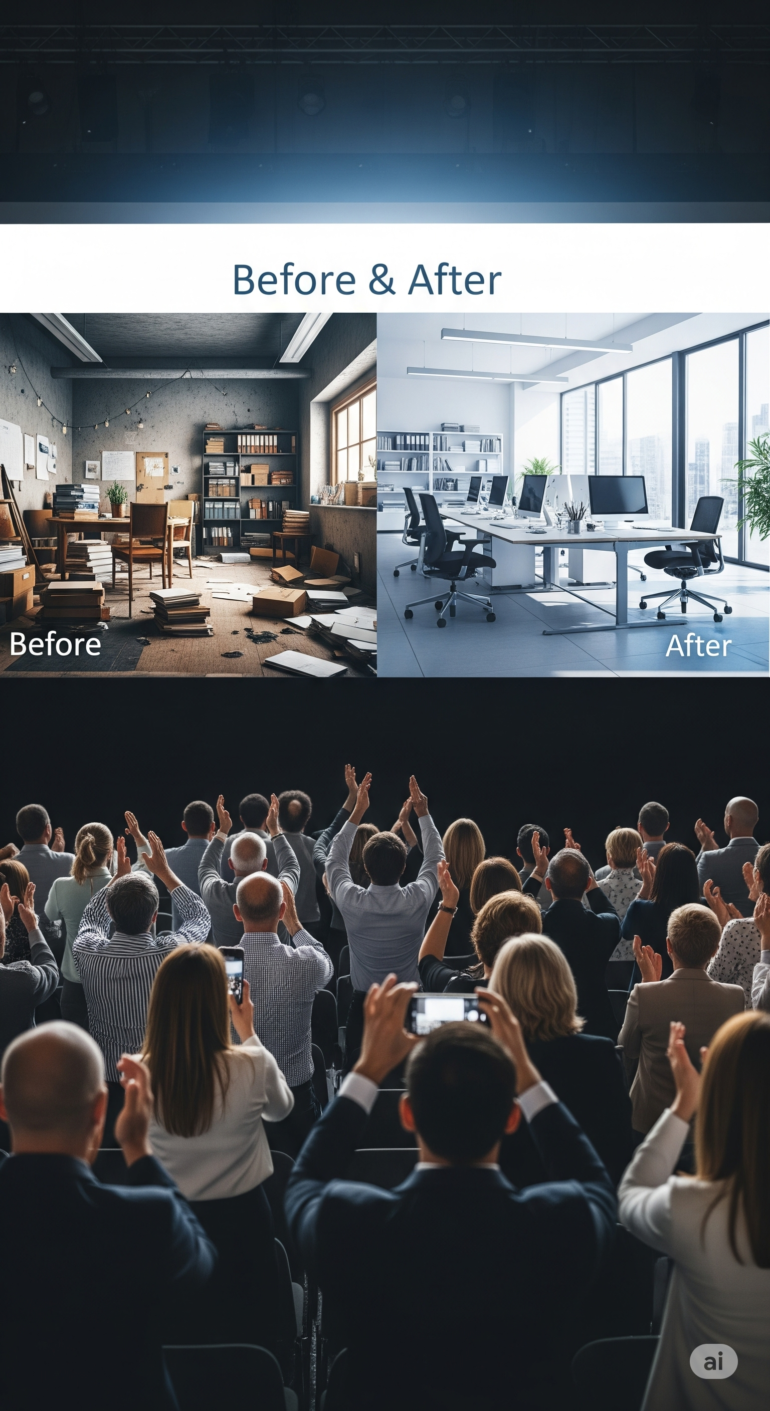 - 작업 공간: 책상 위 서류 정리, 왼쪽에 금속 오브제·시계 배치
