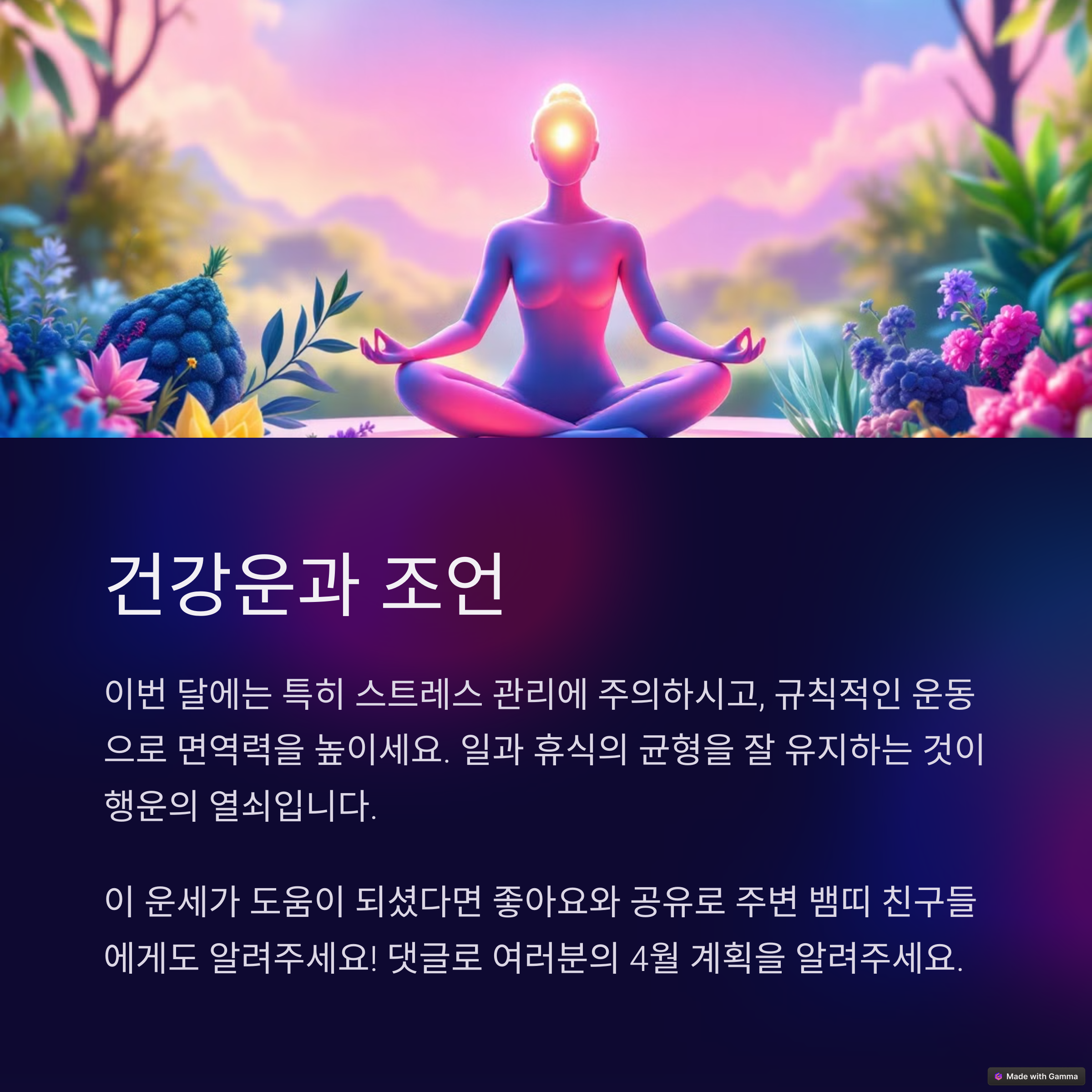 이제 4월을 마무리하며, 5월로 넘어갈 준비를 해야 하는 시기입니다. 재물운은 고른 상승세를 보일 수 있으나, 지출도 함께 늘어날 가능성이 있으므로 가계부나 재무 상태를 꼼꼼히 체크하세요.